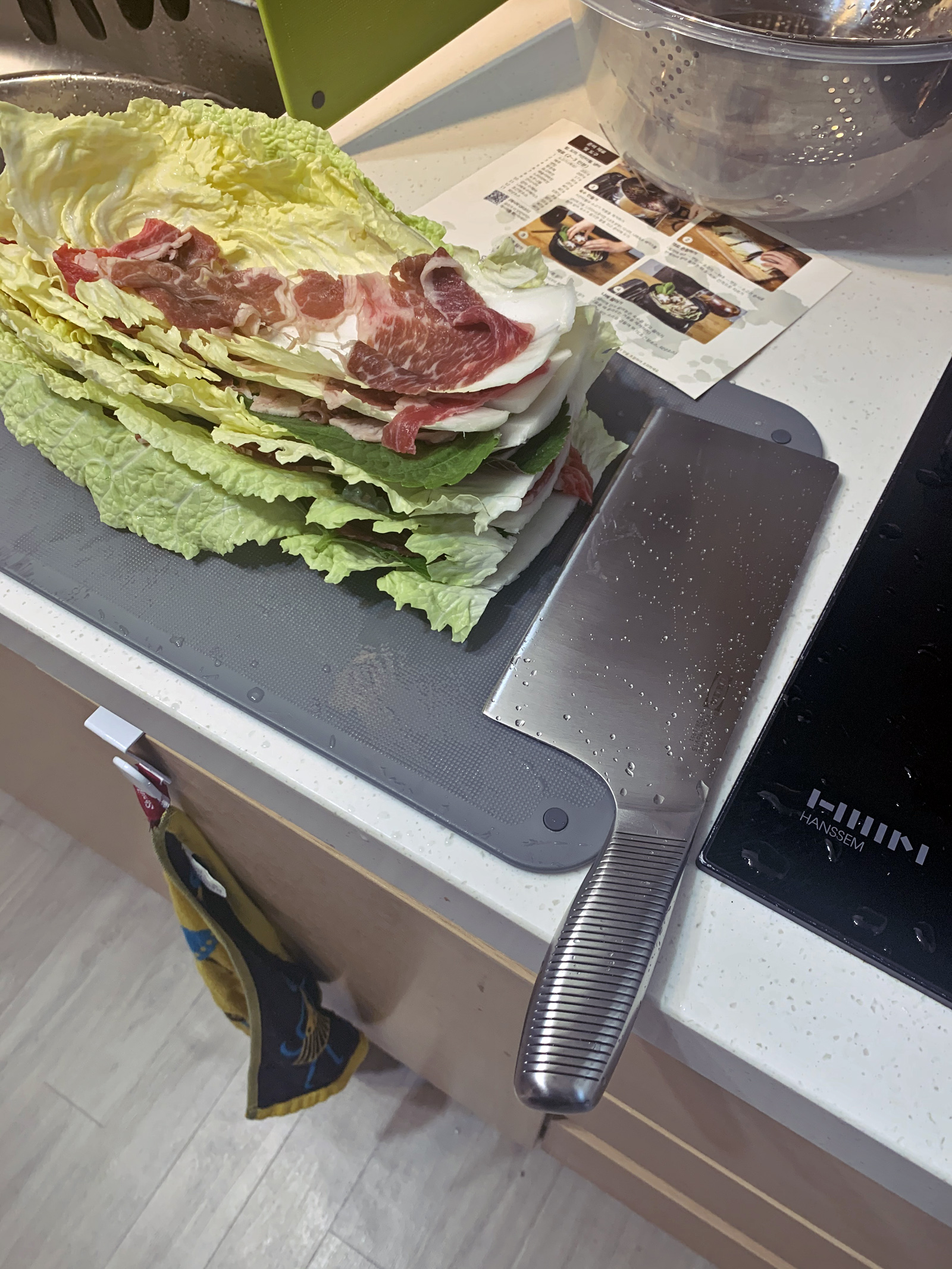 '밀푀유나베' 밀키트를 이용해 요리할 때 중식도를 사용해보았습니다. '송송'써는 상황은 아니었기에 중식도의 매력을 확 느낄 수 있는 정도는 아니었습니다만, 두툼한 재료를 썰 때 칼도 두툼하니 편하긴 하더군요. 아무튼 칼이 바뀌니 칼질 자체가 재미있어진 기분입니다.ㅋㅋㅋ