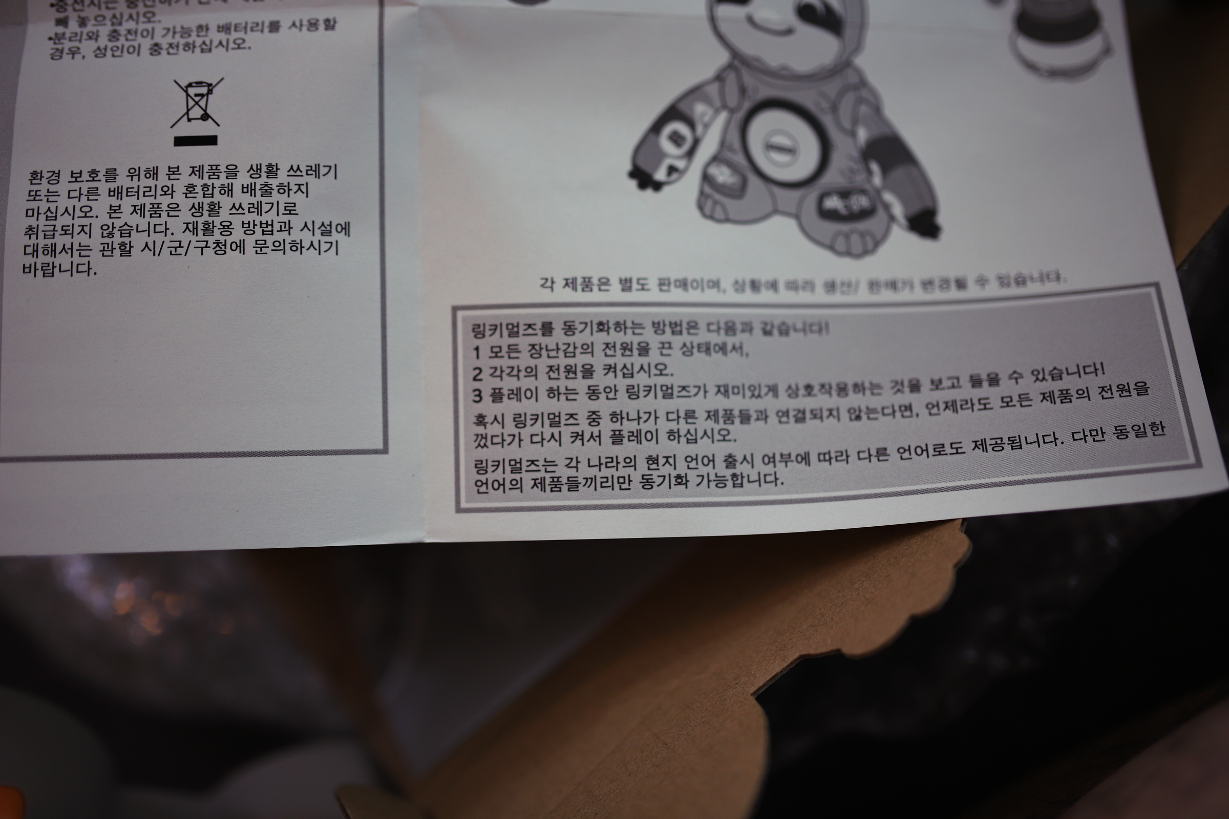 조금 주의해야 할 점은, 나무늘보의 경우 머리와 팔이 움직이는데, 영유아들은 그를 고장낼 수도 있을 것 같습니다. 못 움직이게 꽉 붙잡으면 '딱딱딱딱'소리가 나는데, 이게 고장 나지 않기 위해 의도적으로 기어가 풀리게 되어 있는 건지, 기어가 갈리는 건지, 그걸 잘 모르겠습니다. 약간만 조심해주시면 될 것 같습니다.