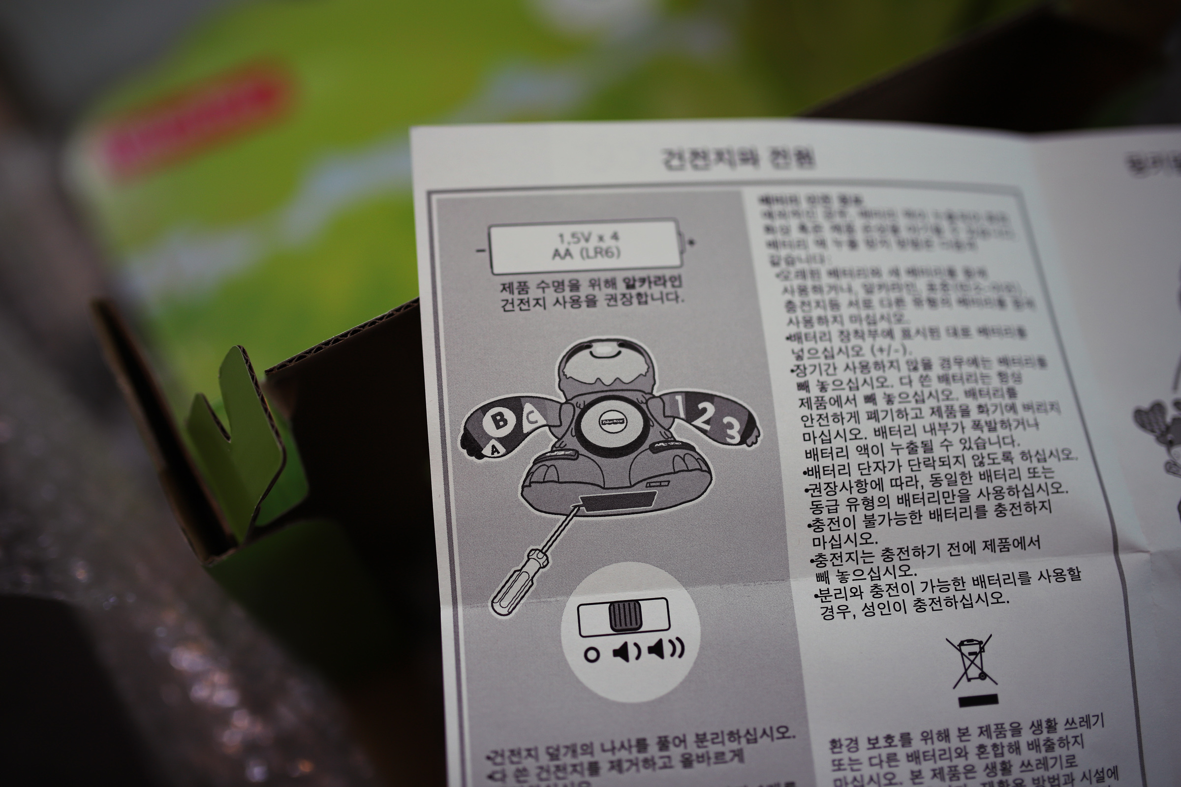 그러다 보니 단점이 하나 생기게 되는데, 바로 배터리가 조금 빨리 닳습니다. 그냥 누르면 불 들어오고 노래 나오는 장난감들은 7, 8개월은 쓰는 것 같은데, 이 녀석은 한 달 만에 배터리를 한번 갈았습니다. 물론 처음에 공짜로 주는 배터리가 좀 싸구려이긴 합니다만...