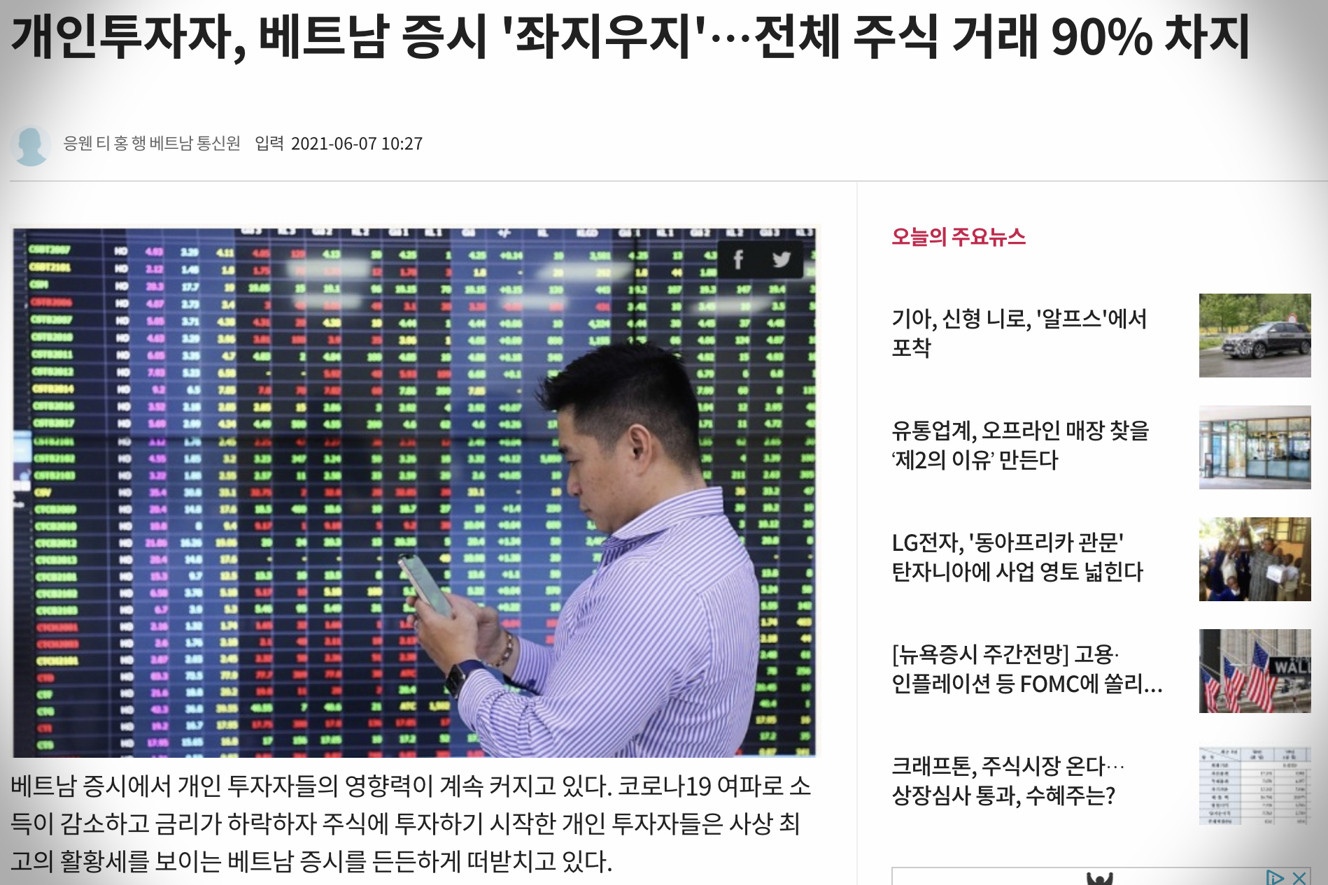 - 베트남은... 오를 만큼 올랐다는 생각이었다. 우리로 치면 코스피 4000 수준이던데... 베트남 국민들도 과열 상태고.