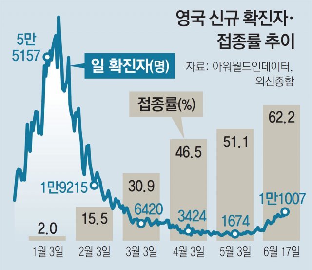 - 백신 접종에도 불구하고 영국에서 확진자가 계속 늘어나고 있다. 인도 변이를 막기엔 1차 접종만으로는 부족하다고.