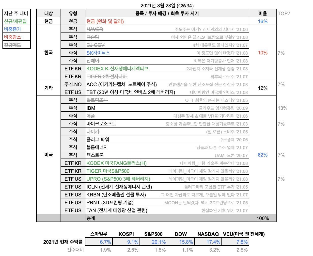 | CW36 투자기록 - 끈질긴 델타변이, 하락장으로 갈까? [+7.5%] (0) | 2021.09.11 |